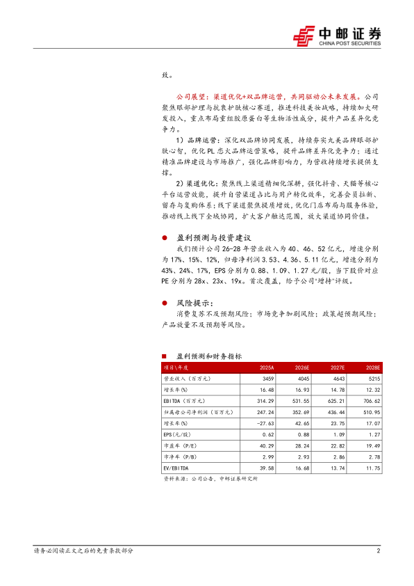 公司展望:渠道优化+双品牌运营,共同驱动公未来发展。公司聚焦眼部护理与抗衰护肤核心赛道,推进科技美妆战略,持续加大研发投入,重点布局重组胶原蛋白等生物活性成分,提升产品差异化竞争力。