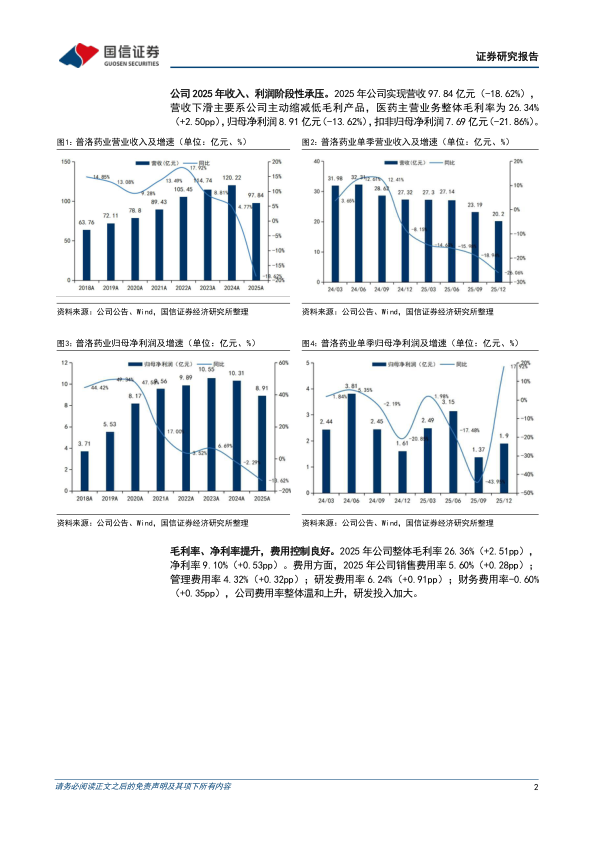 公司2025年收入、利润阶段性承压。2025年公司实现营收97.84亿元(-18.62%),营收下滑主要系公司主动缩减低毛利产品,医药主营业务整体毛利率为26.34%(+2.50pp),归母净利润8.91亿元(-13.62%),扣非归母净利润7.69亿元(-21.86%)。