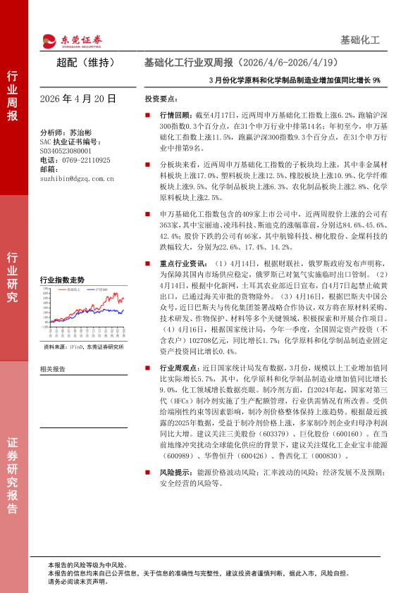 基础化工行业双周报:3月份化学原料和化学制品制造业增加值同比增长9%