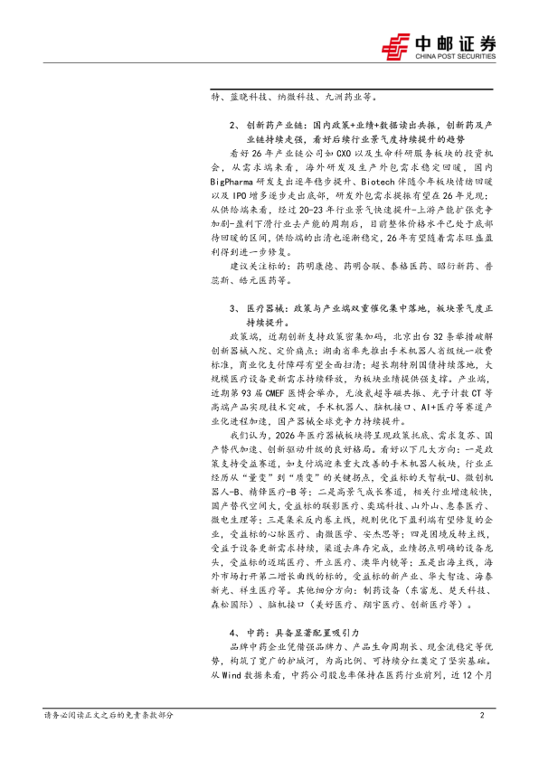 我们认为,2026年医疗器械板块将呈现政策托底、需求复苏、国产替代加速、创新驱动升级的良好格局。看好以下几大方向:一是政策支持受益赛道,如支付端迎来重大改善的手术机器人板块,行业正经历从“量变”到“质变”的关键拐点,受益标的天智航-U、微创机器人-B、精锋医疗-B等;二是高景气成长赛道,相关行业增速较快,国产替代空间大,受益标的联影医疗、奕瑞科技、山外山、惠泰医疗、微电生理等;三是集采反内卷主线,规则优化下盈利端有望修复的企业,受益标的心脉医疗、南微医学、安杰思等;四是困境反转主线,受益于设备更新需求持续,渠道去库存完成,业绩拐点明确的设备龙头,受益标的迈瑞医疗、开立医疗、澳华内镜等;五是出海主线,海外市场打开第二增长曲线的标的,受益标的新产业、华大智造、海泰新光、祥生医疗等。其他细分方向:制药设备(东富龙、楚天科技、森松国际)、脑机接口(美好医疗、翔宇医疗、创新医疗等)。