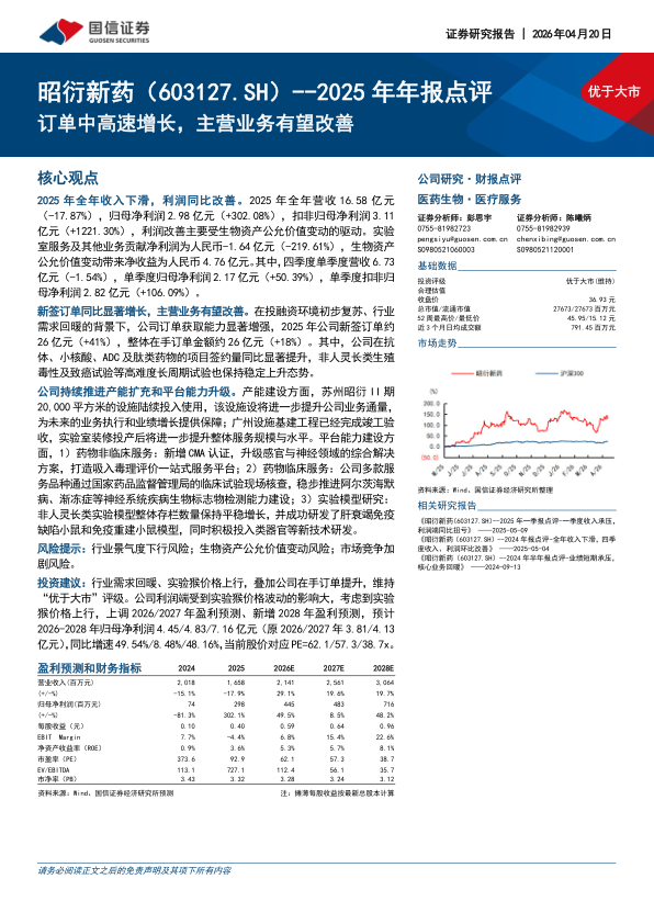 投资建议:行业需求回暖、实验猴价格上行,叠加公司在手订单提升,维持“优于大市”评级。公司利润端受到实验猴价格波动的影响大,考虑到实验猴价格上行,上调2026/2027年盈利预测、新增2028年盈利预测,预计2026-2028年归母净利润4.45/4.83/7.16亿元(原2026/2027年3.81/4.13亿元),同比增速49.54%/8.48%/48.16%,当前股价对应PE=62.1/57.3/38.7x。