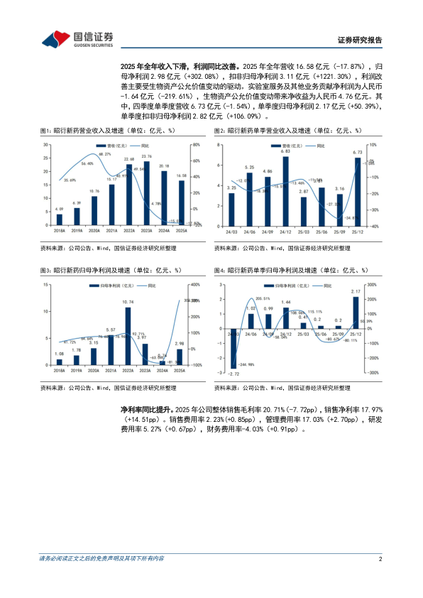 2025年全年收入下滑,利润同比改善。2025年全年营收16.58亿元(-17.87%),归母净利润2.98亿元(+302.08%),扣非归母净利润3.11亿元(+1221.30%),利润改善主要受生物资产公允价值变动的驱动。实验室服务及其他业务贡献净利润为人民币-1.64亿元(-219.61%),生物资产公允价值变动带来净收益为人民币4.76亿元。其中,四季度单季度营收6.73亿元(-1.54%),单季度归母净利润2.17亿元(+50.39%),单季度扣非归母净利润2.82亿元(+106.09%)。