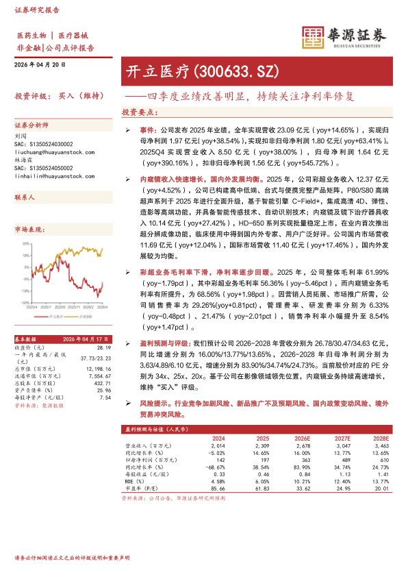 盈利预测与评级:我们预计公司2026-2028年营收分别为26.78/30.47/34.63亿元,同比增速分别为16.00%/13.77%/13.65%,2026-2028年归母净利润分别为3.63/4.89/6.10亿元,增速分别为83.90%/34.74%/24.73%。当前股价对应的PE分别为34x、25x、20x。基于公司在影像领域领先位置,内窥镜业务持续高速增长,维持“买入”评级。