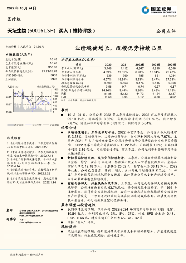重组西安回天,拓展陕西血浆资源。三季度,公司完成西安回天的相关收购及增资,公司持有西安回天63.7%股权。西安回天位于陕西省,于1996年注册成立。获得西安回天控股权后,公司一方面在通过积极推进西安回天的生产经营恢复,一方面通过收购将实现在陕西省的战略布局,拓展陕西省优良血浆资源。公司远期浆量空间值得期待。
