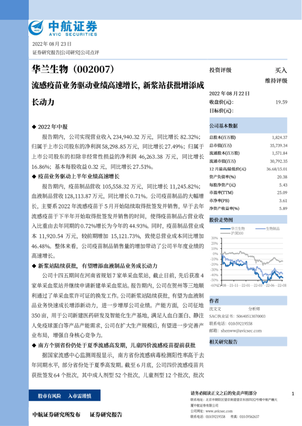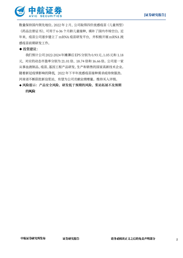 我们预计公司2022-2024年摊薄后EPS分别为0.93元、1.05元和1.18元,对应的动态市盈率分别为21.01倍、18.74倍和16.66倍。公司是一家从事血液制品、疫苗、基因工程产品研发、生产和销售的国家高新技术企业。随着新冠疫情影响的降低,2022年下半年流感疫苗接种需求或持续强劲。河南省不断获批新设浆站,有望为公司贡献业绩增量。维持买入评级。