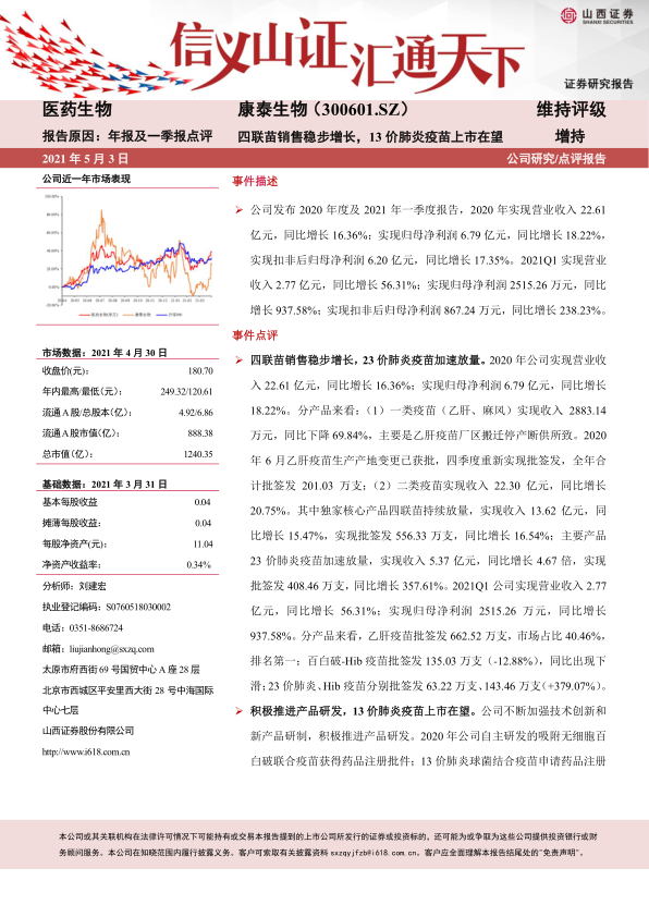 四联苗销售稳步增长,23价肺炎疫苗加速放量。2020年公司实现营业收入22.61亿元,同比增长16.36%;实现归母净利润6.79亿元,同比增长18.22%。分产品来看:(1)一类疫苗(乙肝、麻风)实现收入2883.14万元,同比下降69.84%,主要是乙肝疫苗厂区搬迁停产断供所致。2020年6月乙肝疫苗生产产地变更已获批,四季度重新实现批签发,全年合计批签发201.03万支;(2)二类疫苗实现收入22.30亿元,同比增长20.75%。其中独家核心产品四联苗持续放量,实现收入13.62亿元,同比增长15.47%,实现批签发556.33万支,同比增长16.54%;主要产品23价肺炎疫苗加速放量,实现收入5.37亿元,同比增长4.67倍,实现批签发408.46万支,同比增长357.61%。2021Q1公司实现营业收入2.77亿元,同比增长56.31%;实现归母净利润2515.26万元,同比增长937.58%。分产品来看,乙肝疫苗批签发662.52万支,市场占比40.46%,排名第一;百白破-Hib疫苗批签发135.03万支(-12.88%),同比出现下滑;23价肺炎、Hib疫苗分别批签发63.22万支、143.46万支(+379.07%)。