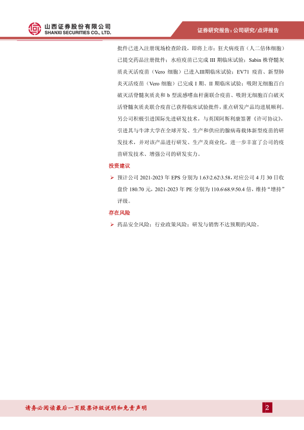 积极推进产品研发,13价肺炎疫苗上市在望。公司不断加强技术创新和新产品研制,积极推进产品研发。2020年公司自主研发的吸附无细胞百白破联合疫苗获得药品注册批件;13价肺炎球菌结合疫苗申请药品注册批件已进入注册现场检查阶段,即将上市;狂犬病疫苗(人二倍体细胞)已提交药品注册批件;水痘疫苗已完成III期临床试验;Sabin株脊髓灰质炎灭活疫苗(Vero细胞)已进入Ⅲ期临床试验;EV71疫苗、新型肺炎灭活疫苗(Vero细胞)已完成I期、II期临床试验;吸附无细胞百白破灭活脊髓灰质炎和b型流感嗜血杆菌联合疫苗、吸附无细胞百白破灭活脊髓灰质炎联合疫苗已获得临床试验批件,重点研发产品均进展顺利。另公司积极引进国际先进研发技术,与英国阿斯利康签署《许可协议》,引进其与牛津大学在全球开发、生产和供应的腺病毒载体新型疫苗的研发技术,并对该产品进行研发、生产及商业化,进一步丰富了公司的疫苗研发技术、增强公司的研发实力。