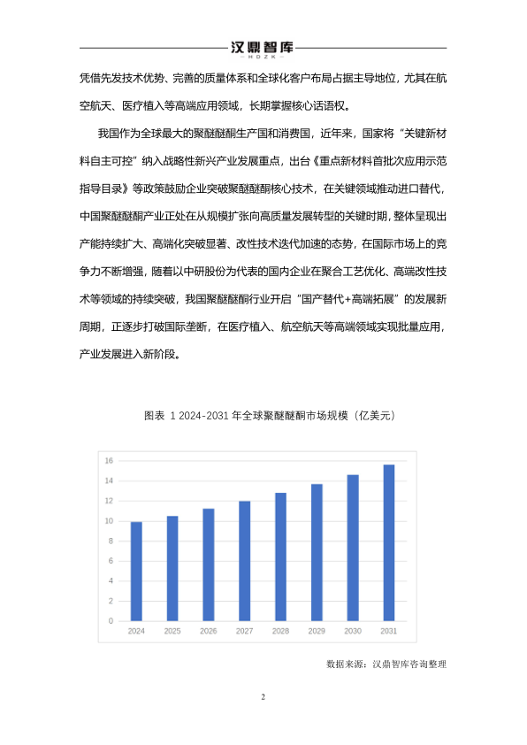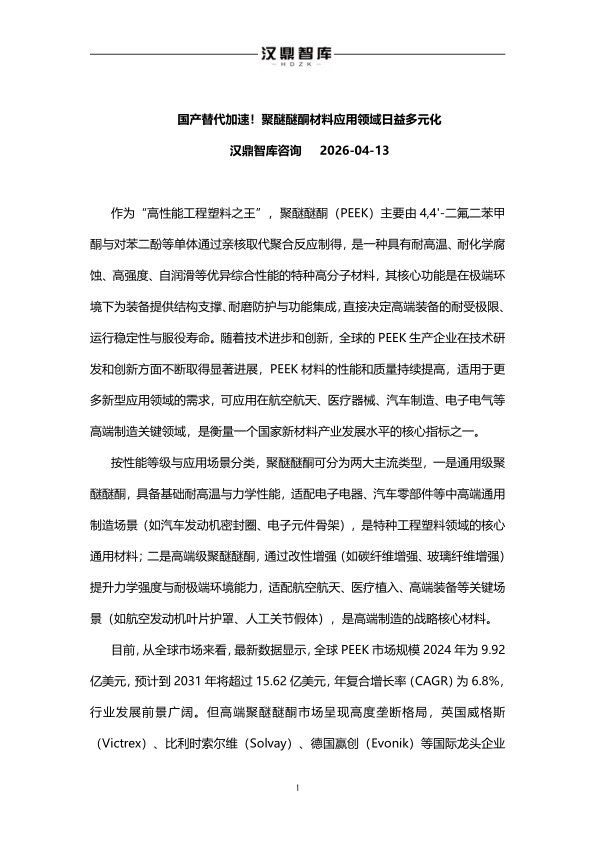 目前,从全球市场来看,最新数据显示,全球PEEK市场规模2024年为9.92亿美元,预计到2031年将超过15.62亿美元,年复合增长率(CAGR)为6.8%,行业发展前景广阔。但高端聚醚醚酮市场呈现高度垄断格局,英国威格斯(Victrex)、比利时索尔维(Solvay)、德国赢创(Evonik)等国际龙头企业凭借先发技术优势、完善的质量体系和全球化客户布局占据主导地位,尤其在航空航天、医疗植入等高端应用领域,长期掌握核心话语权。