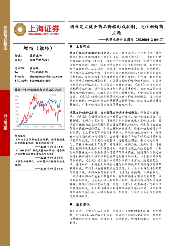 医药生物行业周报:国办发文健全药品价格形成机制,关注创新药主题