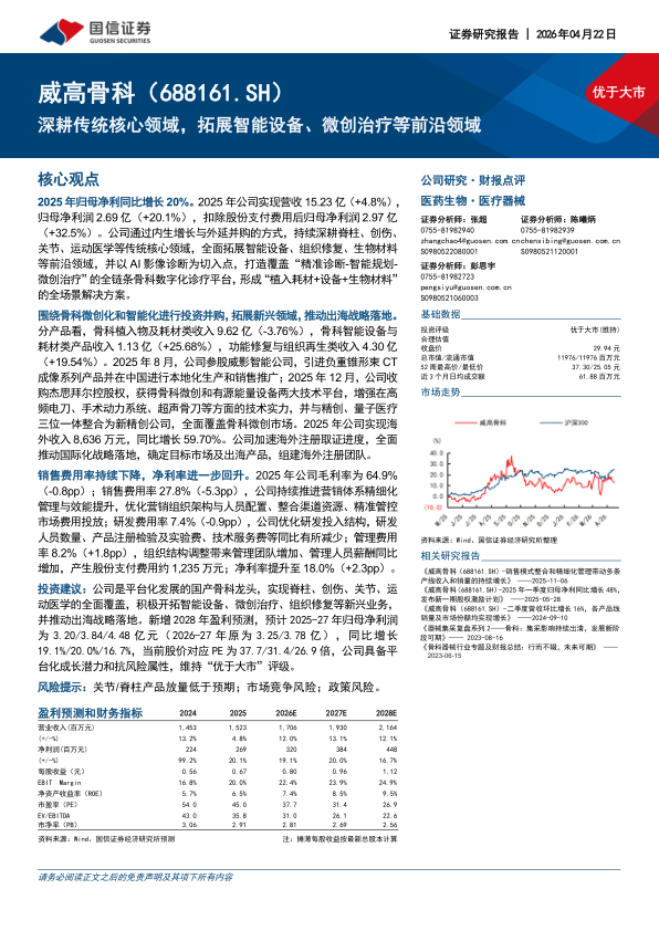 销售费用率持续下降,净利率进一步回升。2025年公司毛利率为64.9%(-0.8pp);销售费用率27.8%(-5.3pp),公司持续推进营销体系精细化管理与效能提升,优化营销组织架构与人员配置、整合渠道资源、精准管控市场费用投放;研发费用率7.4%(-0.9pp),公司优化研发投入结构,研发人员数量、产品注册检验及实验费、技术服务费等同比有所减少;管理费用率8.2%(+1.8pp),组织结构调整带来管理团队增加、管理人员薪酬同比增加,产生股份支付费用约1,235万元;净利率提升至18.0%(+2.3pp)。投资建议:公司是平台化发展的国产骨科龙头,实现脊柱、创伤、关节、运动医学的全面覆盖,积极开拓智能设备、微创治疗、组织修复等新兴业务,并推动出海战略落地。新增2028年盈利预测,预计2025-27年归母净利润为3.20/3.84/4.48亿元(2026-27年原为3.25/3.78亿),同比增长19.1%/20.0%/16.7%,当前股价对应PE为37.7/31.4/26.9倍,公司具备平台化成长潜力和抗风险属性,维持“优于大市”评级。