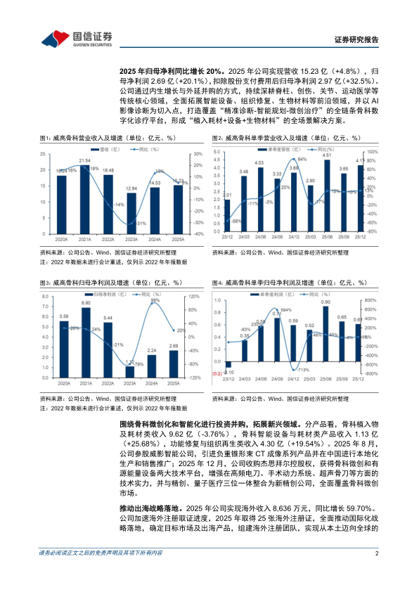 围绕骨科微创化和智能化进行投资并购,拓展新兴领域,推动出海战略落地。分产品看,骨科植入物及耗材类收入9.62亿(-3.76%),骨科智能设备与耗材类产品收入1.13亿(+25.68%),功能修复与组织再生类收入4.30亿(+19.54%)。2025年8月,公司参股威影智能公司,引进负重锥形束CT成像系列产品并在中国进行本地化生产和销售推广;2025年12月,公司收购杰思拜尔控股权,获得骨科微创和有源能量设备两大技术平台,增强在高频电刀、手术动力系统、超声骨刀等方面的技术实力,并与精创、量子医疗三位一体整合为新精创公司,全面覆盖骨科微创市场。2025年公司实现海外收入8,636万元,同比增长59.70%。公司加速海外注册取证进度,全面推动国际化战略落地,确定目标市场及出海产品,组建海外注册团队。