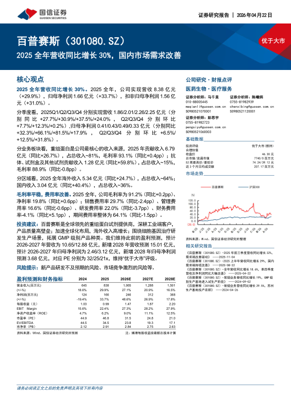 投资建议:百普赛斯是全球领先的重组蛋白试剂提供商,深耕工业端客户,产品质量高壁垒;加速全球化布局,海外收入高增长;围绕细胞基因治疗研发生产场景,拓展GMP级别产品种类。我们维持此前的盈利预测,预计2026-2027年营收为10.65/12.88亿元,新增2028年营收预测15.01亿元,预计2026-2027年归母净利润为2.46/3.12亿元,新增2028年归母净利润预测3.68亿元,对应PE分别为32/25/21x,维持“优于大市”评级。