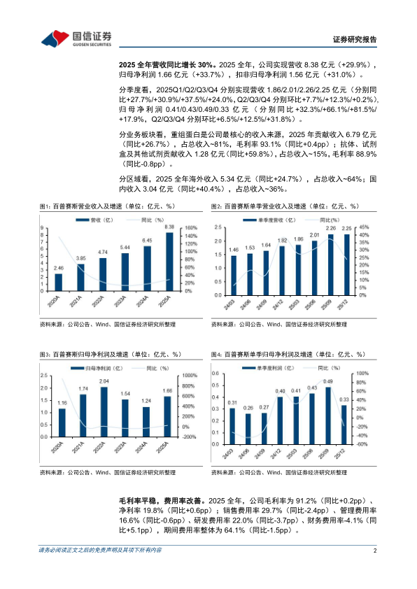 分业务板块看,重组蛋白是公司最核心的收入来源,2025年贡献收入6.79亿元(同比+26.7%),占总收入~81%,毛利率93.1%(同比+0.4pp);抗