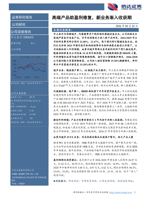 开立医疗为深耕超声、内窥镜等多产线的领先器械设备企业,公司战略定位高端严肃医疗设备产品,多年来持续发力投入新产品研发,2024-2025年公司的研发费用率分别为23.48%、21.47%,高于国内同行器械设备企业。我们认为历经2024年国内医疗机构招投降价及标终端需求疲弱大环境下,公司战略性投入外科硬镜、血管内超声等新业务导致的利润下滑已接近尾声,随着招标修复及公司设备AI应用升级性能、内窥镜高端机型HD650上量,外科硬镜和血管内超声销售渐渐规模,海外出口持续稳步增长,2026-2028公司盈利能力有望持续修复,公司收入端有望持续15-20%稳健增长,净利率水平有望逐步修复至15-20%的水平。