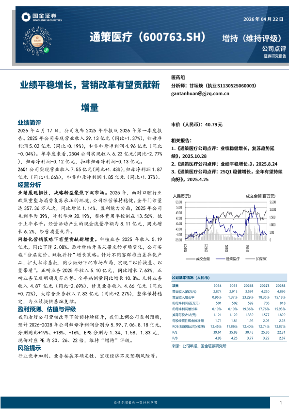 我们看好公司营销改革下份额持续提升,我们上调公司盈利预测,预计2026-2028年公司归母净利润分别为5.99、7.06、8.18亿元,分别同比+19%、+18%、+16%,EPS分别为1.34、1.58、1.83元,现价对应PE为30、26、22倍,维持“增持”评级。
