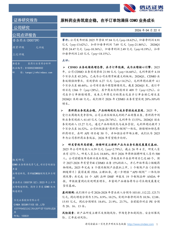 原料药业务筑底企稳,在手订单饱满保CDMO业务成长