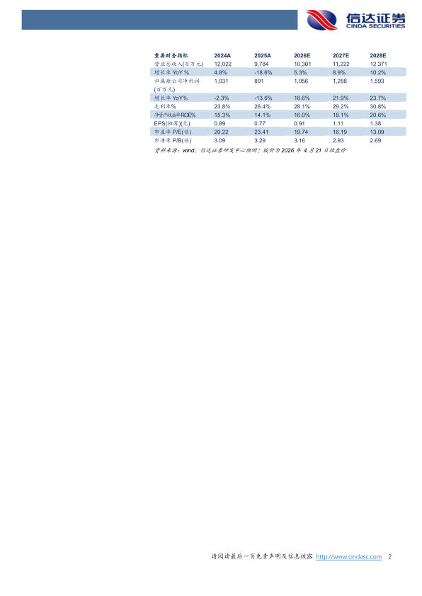盈利预测:我们预计公司2026-2028年营业收入分别为103.01、112.22、123.71亿元,同比增速分别为5.3%、8.9%、10.2%,实现归母净利润为10.56、12.88、15.93亿元,同比分别增长18.6%、21.9%、23.7%,当前股价对应PE分别为20、16、13倍。