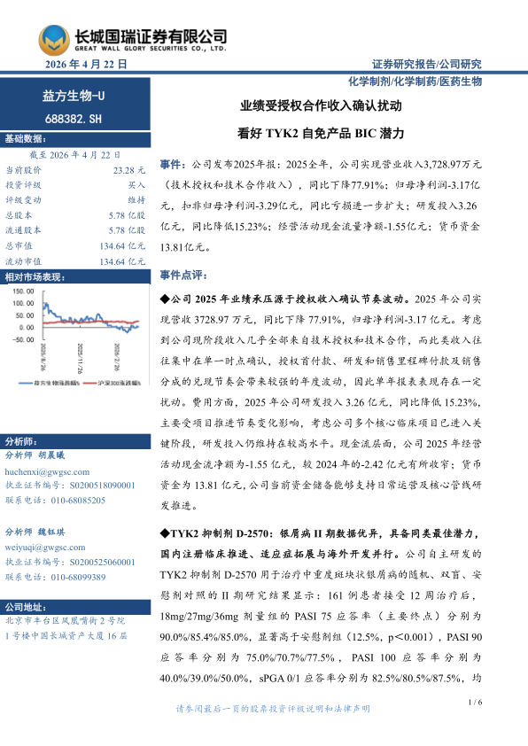 业绩受授权合作收入确认扰动 看好TYK2自免产品BIC潜力