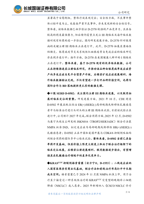 KRASG12C抑制剂格索雷塞(安方宁®, D-1553) : 二线适应症纳入国家医保夯实商业化基础, 联合疗法和前线治疗布局打开中长期成长空间。 格索雷塞已于 2024 年 11 月获 NMPA 批准上市, 用于治疗至少接受过一种系统性治疗的 KRASG12C 突变型的晚期非小细胞肺癌(NSCLC) 成人患者。 2025 年新增纳入《CSCO NSCLC 诊疗指南》 后线治疗 I 级推荐, 并于 2025 年 12 月进入国家医保目录,标志着产品已完成从注册获批到医保覆盖的关键商业化路径打通,2026 年起有望逐步进入更实质性的放量阶段。 另一方面, 格索雷塞的价值并不局限于当前后线 NSCLC 单药场景, 而在于其围绕前线治疗、 适应症拓展及联合疗法持续打开成长空间: (1)公司已与应世生物围绕格索雷塞+FAK 抑制剂 Ifebemtinib(IN10018) 的联合疗法开展全球合作, 临床结果显示, 该联合方案在 KRASG12C 突变一线NSCLC 及既往经治 CRC 患者中均展现出积极疗效信号, 提示格索雷塞有望通过联合治疗实现治疗线前移, 并进一步打开在消化道肿瘤领域的应用空间。 (2)2025 年 6 月, 格索雷塞单药或联合西妥昔单抗治疗晚期或转移性 KRASG12C突变 CRC 的研究结果发表于《信号转导与靶向治疗》 , 无论单药还是联合西妥昔单抗, 格索雷塞均展现出较好的抗肿瘤活性和安全性, 且显示出联合疗法较单药更优的疗效表现, 进一步验证了格索雷塞在 CRC 领域通过联合疗法打开临床价值空间的潜力。 (3)2025 年 12 月, 格索雷塞治疗 KRASG12C突变晚期胰腺癌患者的研究结果发表于《英国癌症杂志》 , ORR=45.5%,DCR=86.4%, mPFS=7.6m, mOS 未达到, 6 个月 OS 率达 79.2%,考虑到晚期胰腺癌整体预后较差、 治疗选择有限且临床需求迫切,该研究为格索雷塞成为相关患者的重要治疗新选择提供了积极依据, 并为后续临床开发及适应症拓展奠定了基础。 整体来看, 格索雷塞短期有望受益于医保落地后商业化爬坡带来的分成兑现, 中长期则更值得关注临床研究数据持续积累及适应症扩展对资产定价空间的进一步打开