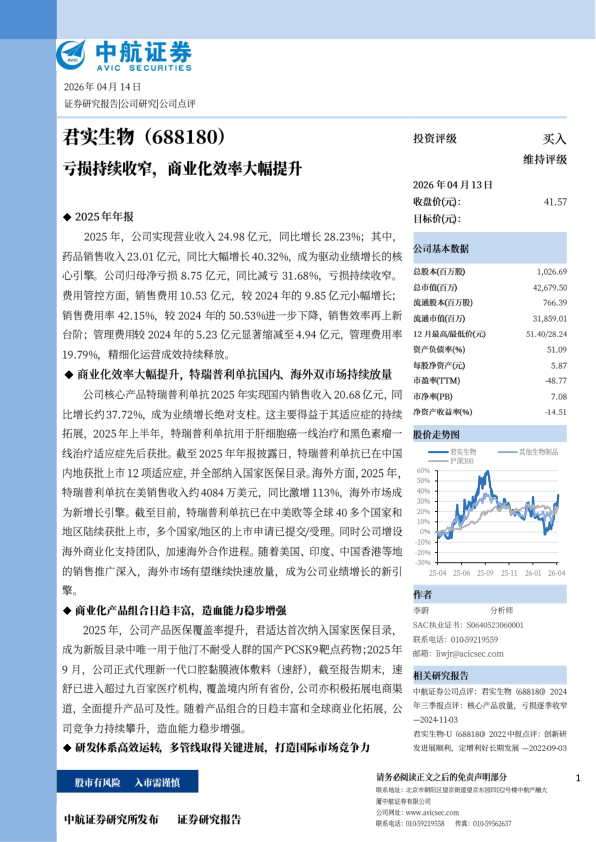 投资建议:公司处于商业化快速放量期,整体费用端管控成效显著,经营持续优化。叠加全球市场拓展,公司的商业化竞争力持续提升,近三年有望迎来管线与业绩双重突破。我们预计公司2026-2028年收入分别为33.70亿元、44.49亿元和54.06亿元,预计同比增长率分别为34.88%、32.01%和21.53%,归母净利润分别为-4.16亿元、0.85亿元和4.68亿元,维持“买入”评级。