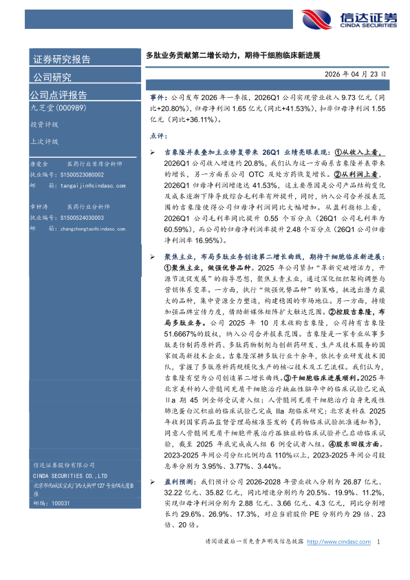 聚焦主业,布局多肽业务创造第二增长曲线,期待干细胞临床新进展:①聚焦主业,做强优势品种。2025年公司紧扣“革新突破增活力,开源节流促发展”的指导思想,聚焦主责主业,通过深化组织架构调整与营销体系变革。一方面,执行“做强优势品种”的策略,挑选出潜力最大的品种,集中资源全力塑造,构建稳固的市场地位。另一方面,持续加强品牌宣传力度,借助新媒体矩阵扩大触达范围。②控股吉象隆,布局多肽业务。公司2025年10月末收购吉象隆,公司持有吉象隆51.6667%的股权,纳入公司合并报表范围。吉象隆是一家专业从事多肽类仿制药原料药、多肽药物制剂与创新药研发、生产及技术服务的国家级高新技术企业。吉象隆深耕多肽行业十余年,依托专业研发技术团队,掌握了多肽原料药规模化生产的核心技术及工艺流程。我们认为,吉象隆有望为公司创造第二增长曲线。③干细胞临床进展顺利。2025年北京美科的人骨髓间充质干细胞治疗缺血性脑卒中的临床试验已完成Ⅱa期45例全部受试者入组;人骨髓间充质干细胞治疗自身免疫性肺泡蛋白沉积症的临床试验已完成IIa期临床研究;北京美科在2025年收到国家药品监督管理局核准签发的《药物临床试验批准通知书》,同意人骨髓间充质干细胞开展治疗孤独症的临床试验并已启动临床试验,截至2025年底完成成人组6例受试者入组。④股东回报方面。2023-2025年间公司分红比例均在110%以上,2023-2025年间公司股息率分别为3.95%、3.77%、3.44%。