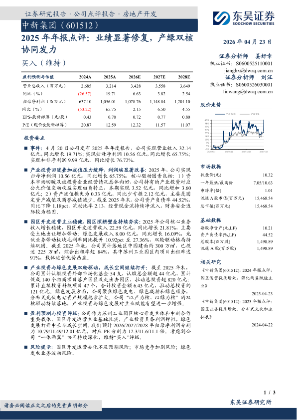 盈利预测与投资评级:公司作为苏州工业园区核心开发主体和中新合作重要载体,园区开发运营主业基础扎实,产业投资具备利润弹性,绿色发展打开中长期成长空间。我们预计2026/2027/2028年归母净利润分别为10.79/11.49/12.01亿元,对应PE分别为12.3/11.6/11.1倍。考虑到公司“一体两翼”协同持续深化,维持“买入”评级。
