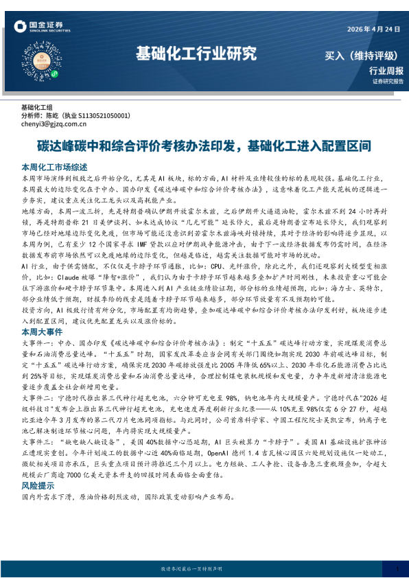 基础化工行业研究:碳达峰碳中和综合评价考核办法印发,基础化工进入配置区间