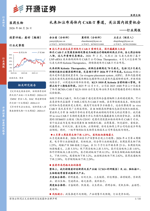 医药生物行业周报:礼来加注布局体内CAR-T赛道,关注国内投资机会