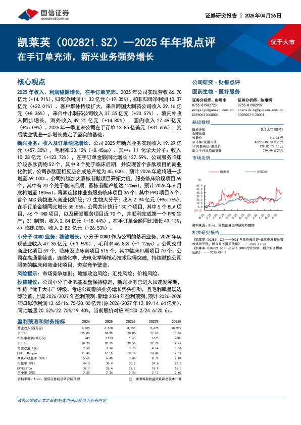 投资建议:公司小分子业务基本盘保持稳定,新兴业务已进入加速发展期,维持“优于大市”评级。考虑公司新兴业务增长势头强劲,且毛利率呈现边际改善,上调2026/2027年盈利预测、新增2028年盈利预测,预计2026-2028年归母净利润13.65/16.75/20.00亿元(原2026/2027年12.89/14.64亿元)、同比增速20.52%/22.75%/19.40%,当前股价对应PE=30.2/24.6/20.6x。