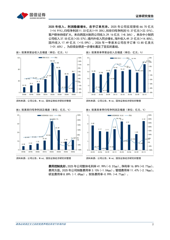 2025年收入、利润稳健增长,在手订单充沛。2025年公司实现营收66.70亿元(+14.91%),归母净利润11.33亿元(+19.35%),扣非归母净利润10.37亿元(+22.01%)。客户群体持续扩大,来自跨国大制药公司收入29.16亿元(+8.36%),来自中小制药公司收入37.55亿元(+20.57%)。境内外收入同步增长,海外收入49.21亿元(+14.85%),国内收入17.49亿元(+15.09%)。2026年一季度末公司在手订单13.85亿美元(+31.65%),为后续业绩进一步增长奠定了坚实的基础。