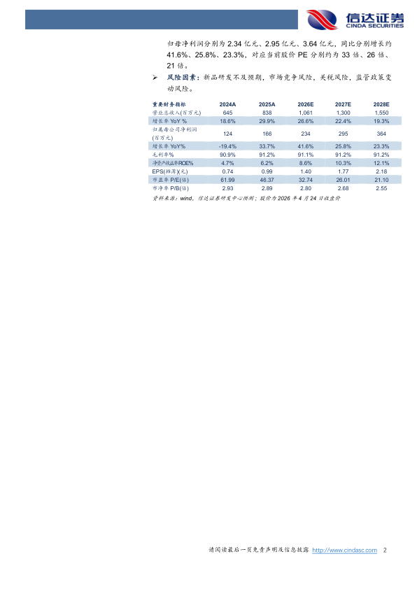 盈利预测:我们预计公司2026-2028年营业收入分别为10.61亿元、13亿元、15.5亿元,同比增速分别约为26.6%、22.4%、19.3%,实现归母净利润分别为2.34亿元、2.95亿元、3.64亿元,同比分别增长约41.6%、25.8%、23.3%,对应当前股价PE分别约为33倍、26倍、21倍。