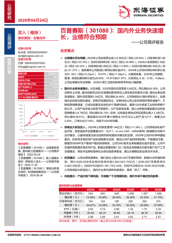 投资建议: 公司业绩快速增长,我们适当上调2026-2027年盈利预测,新增2028年盈利预测, 预计2026-2028年实现归母净利润2.26/2.93/3.74亿元( 2026-2027年原预测为2.08/2.52亿元),对应EPS分别为1.35/1.75/2.24元,对应PE分别为34.18/26.35/20.64倍。公司持续加大研发投入,国内外业务均保持快速增长, 维持“买入” 评级。
