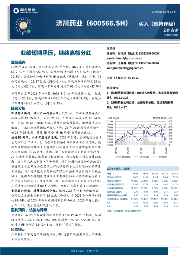 业绩短期承压,继续高额分红