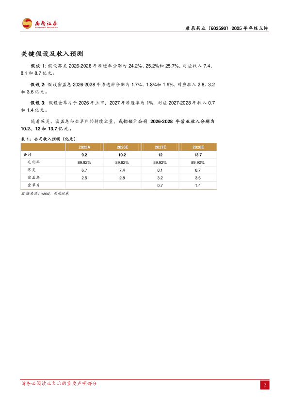 营销能力建设成效持续显现,核心产品市场竞争力持续提升。围绕“苏灵”、“密盖息”两大核心产品,公司以“抓客户,强覆盖,落学术,高合规”为关键抓手,不断深化产品差异化与数字化营销优势。2025年苏灵收入6.7亿元(+12.9%),密盖息收入2.5亿元(+5.7%),核心产品市场竞争力持续提升。