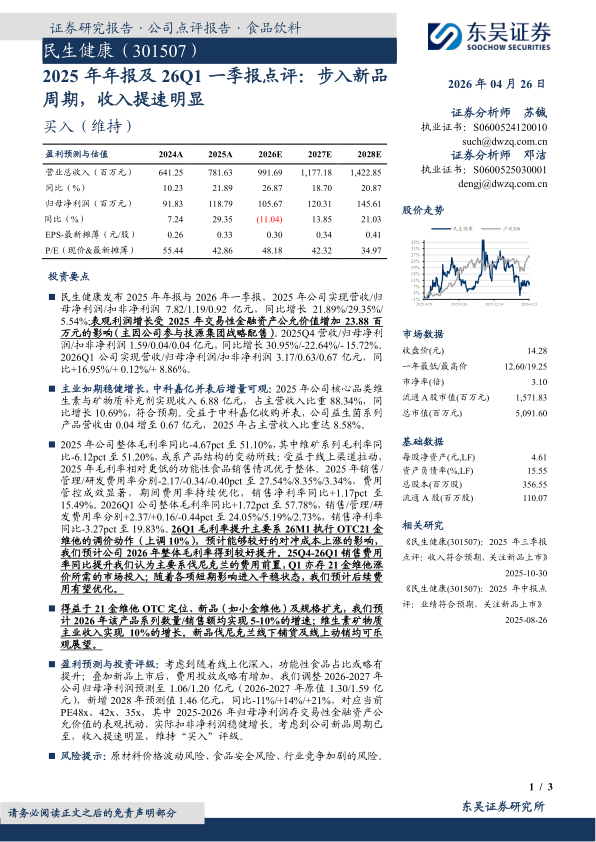 民生健康发布2025年年报与2026年一季报,2025年公司实现营收/归母净利润/扣非净利润7.82/1.19/0.92亿元,同比增长21.89%/29.35%/5.54%;表观利润增长受2025年交易性金融资产公允价值增加23.88百万元的影响(主因公司参与技源集团战略配售)。2025Q4营收/归母净利润/扣非净利润1.59/0.04/0.04亿元,同比增长30.95%/-22.64%/-15.72%。2026Q1公司实现营收/归母净利润/扣非净利润3.17/0.63/0.67亿元,同比+16.95%/+0.12%/+8.86%。