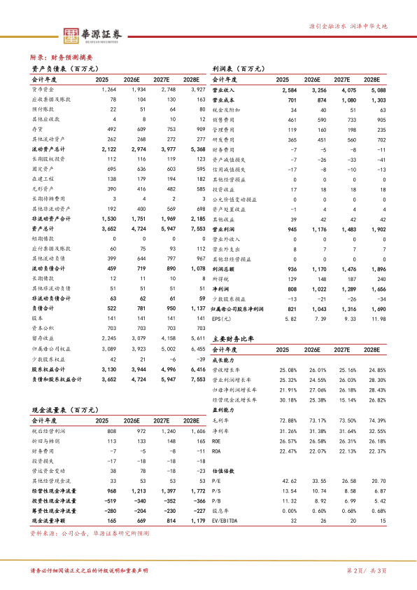 事件:公司发布2025年和2026年一季度业绩,2025年实现营收25.84亿元(yoy+25.08%),实现归母净利润8.21亿元(yoy+21.91%),实现扣非归母净利润7.91亿元(yoy+23.00%)。2026Q1实现营业收入7.04亿元(yoy+24.78%),实现归母净利润2.29亿元(yoy+25.27%),实现扣非归母净利润2.25亿元(yoy+24.72%)。