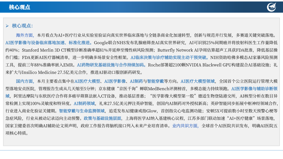海外方面,本月看点为AI+医疗行业从实验室验证向真实世界临床落地与全链条商业化加速转型,创新与规范并行发展,多赛道关键突破落地。AI医学影像与设备临床落地加速、标准化推进。Google联合NHS发布乳腺癌筛查AI真实世界研究,AI可识别25%间期癌并将放射科医生工作量降低约40%;Stanford Merlin3D CT模型诊断准确率超81%并延伸至慢性病风险预测;Butterfly Network AI孕周估算超声工具获FDA批准,降低基层操作门槛;FDA更新AI医疗器械清单,进一步明确多场景安全性框架。AI临床决策与诊疗辅助实现主动干预突破。NIH资助哈佛多模态AI家暴风险预测工具,提前三年88%准确率嵌入EMR。AI药物研发基础设施与合作持续加码。Roche部署超2100颗NVIDIA Blackwell GPU构建混合AI基础设施;礼来扩大与Insilico Medicine27.5亿美元合作,推进AI驱动口服创新药研发。