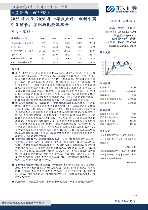 事件:1.2025年,公司实现营收17.46亿元(-1.75%,同比,下同),归母净利润3.06亿元(+20.05%),扣非归母净利2.48亿元(+28.69%),经营性现金流净额3.85亿元(+97.30%)。单季度看,2025Q4实现营收4.93亿元,创历史新高,实现同比、环比双增长。25年全年收入端小幅下滑主要系:1)部分产品受集采及价格联动影响;2)呼吸系统用药因高基数及流感发病率下降而下滑;3)筱熊猫药业等不再并表。2.2026Q1,公司实现营收4.63亿元(+10.69%),归母净利润8839万元(+0.15%),扣非归母净利8584万元(+21.19%)。公司收入及扣非利润均实现稳健增长,主要系公司持续加大营销推广力度,核心产品销量稳步增长,同时部分原材料价格回落叠加成本管控,共同驱动业绩稳健上扬。