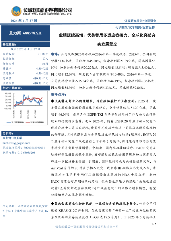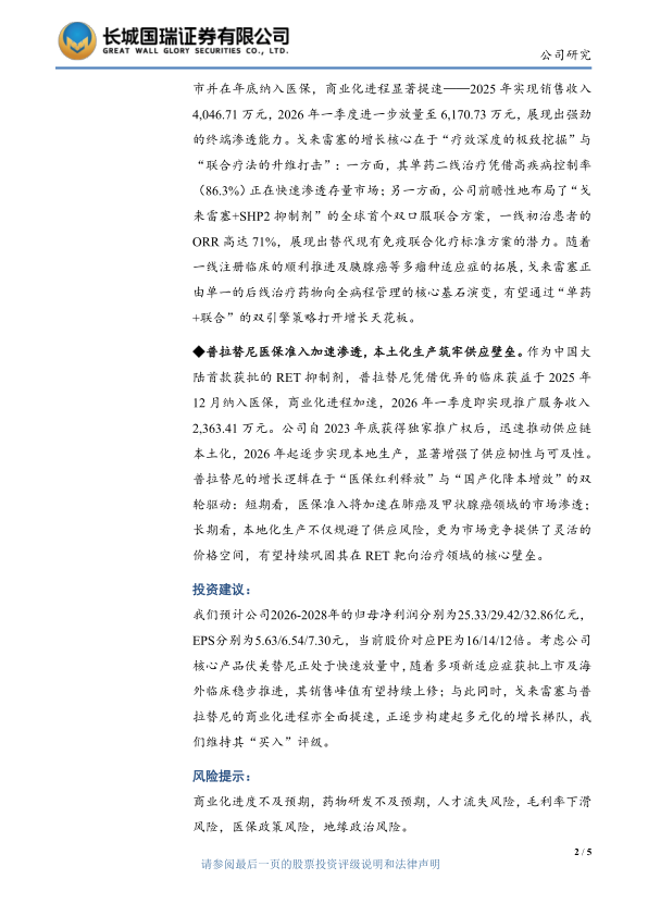 我们预计公司2026-2028年的归母净利润分别为25.33/29.42/32.86亿元,EPS分别为5.63/6.54/7.30元,当前股价对应PE为16/14/12倍。考虑公司核心产品伏美替尼正处于快速放量中,随着多项新适应症获批上市及海外临床稳步推进,其销售峰值有望持续上修;与此同时,戈来雷塞与普拉替尼的商业化进程亦全面提速,正逐步构建起多元化的增长梯队,我们维持其“买入”评级。