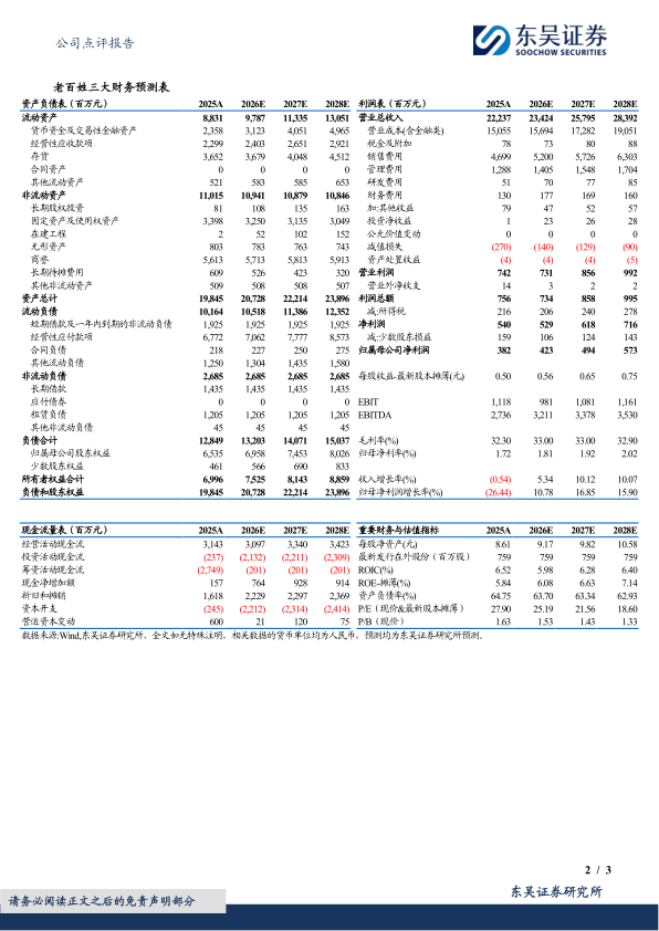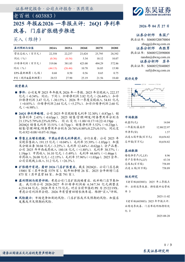 盈利预测与投资评级:考虑公司门店扩张战略重启,收并购门店节奏加速,我们将公司2026-2027年归母净利润由6.34/7.34亿元调整至4.23/4.94亿元,2028年为5.73亿元,对应当前市值的PE为25/22/19X,考虑公司利润率企稳,2026年有望重回增长快车道,维持“买入”评级。