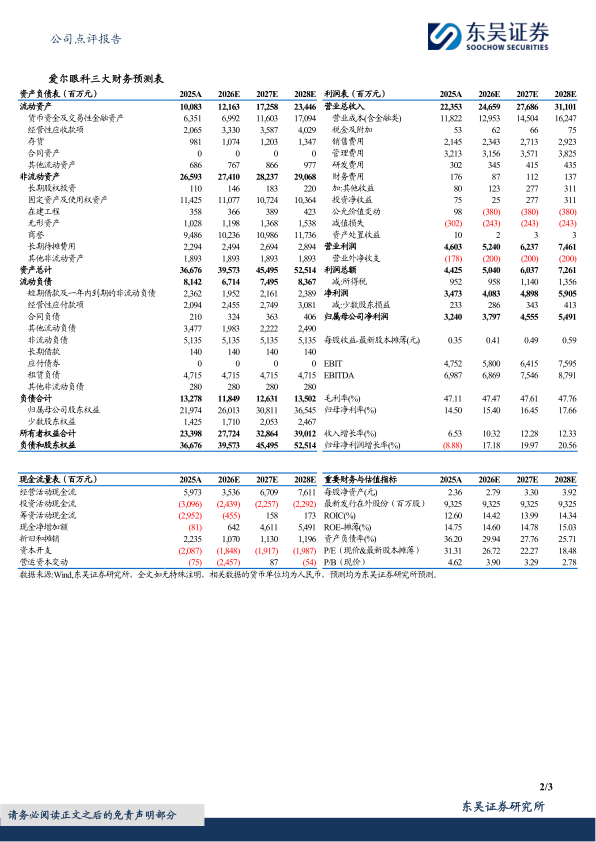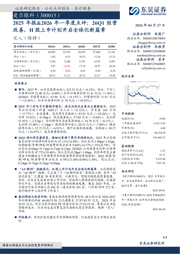 盈利预测与投资评级:考虑宏观环境等因素影响,我们将公司2026-2027年归母净利润由46.80/53.50亿元调整至37.97/45.55亿元,2028年为54.91亿元,对应当前市值的PE估值分别为27/22/18倍。考虑公司为民营眼科龙头,行业仍受益消费复苏及老龄化需求等因素,维持“买入”评级。