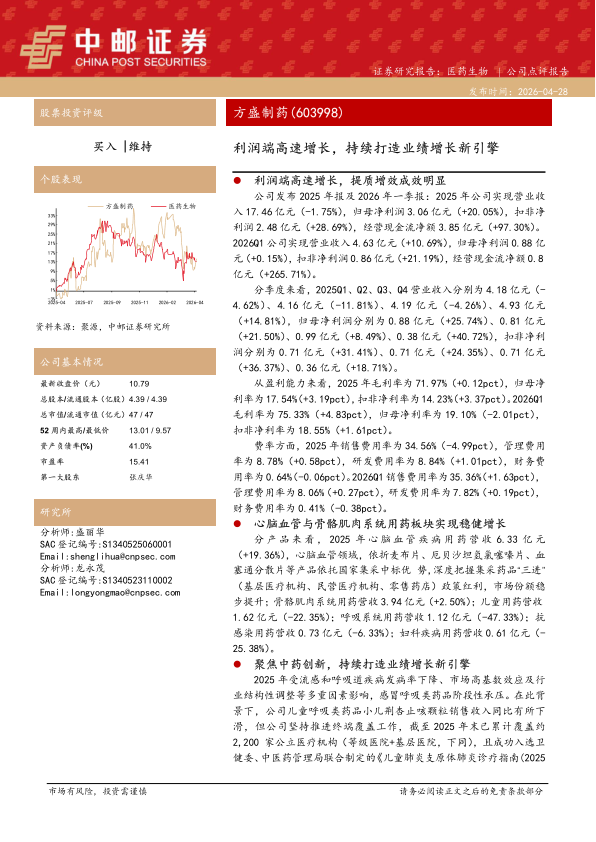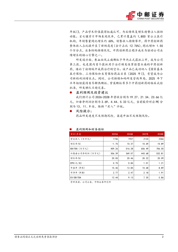 研发端方面,养血祛风止痛颗粒于年内正式获批上市,成为公司第三款、也是国内首个获批用于治疗频发性紧张型头痛的中药创新药,填补了该领域中成药治疗的空白。该产品已成功纳入《国家基本医疗保险、工伤保险和生育保险药品目录(2025年)》,有望成为公司新的利润增长点。同时,公司持续加码研发管线布局,2025年下半年相继获得香芩解热颗粒、紫英颗粒等多个中药创新药的临床试验批准,研发梯队日趋完善。