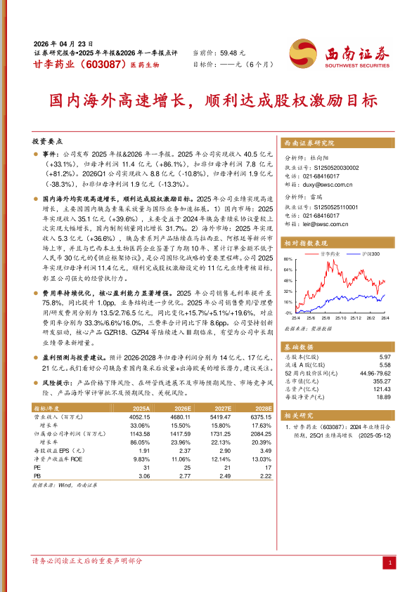 国内海外均实现高速增长,顺利达成股权激励目标。2025年公司业绩实现高速增长,主要因国内胰岛素集采放量与国际业务加速拓展。1)国内市场:2025年实现收入35.1亿元(+39.6%),主要受益于2024年胰岛素续采协议量较上次实现大幅增长,国内制剂销量同比增长31.7%。2)海外市场:2025年实现收入5.3亿元(+36.6%),胰岛素系列产品陆续在马拉西亚、阿根廷等新兴市场上市,并且与巴西本土生物医药企业签署了为期10年、累计订单金额不低于人民币30亿元的《供应框架协议》,是公司国际化战略的重要里程碑。公司2025年实现归母净利润11.4亿元,顺利完成股权激励设定的11亿元业绩考核目标,彰显公司强大的经营执行力。