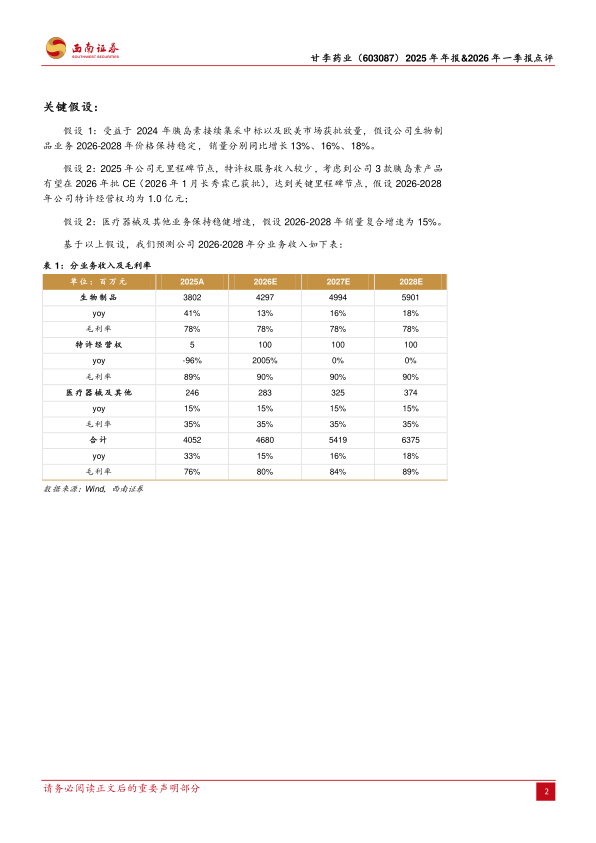 盈利预测与投资建议。预计2026-2028年归母净利润分别为14亿元、17亿元、21亿元。我们看好公司胰岛素国内集采后放量+出海欧美的增长潜力,建议关注。