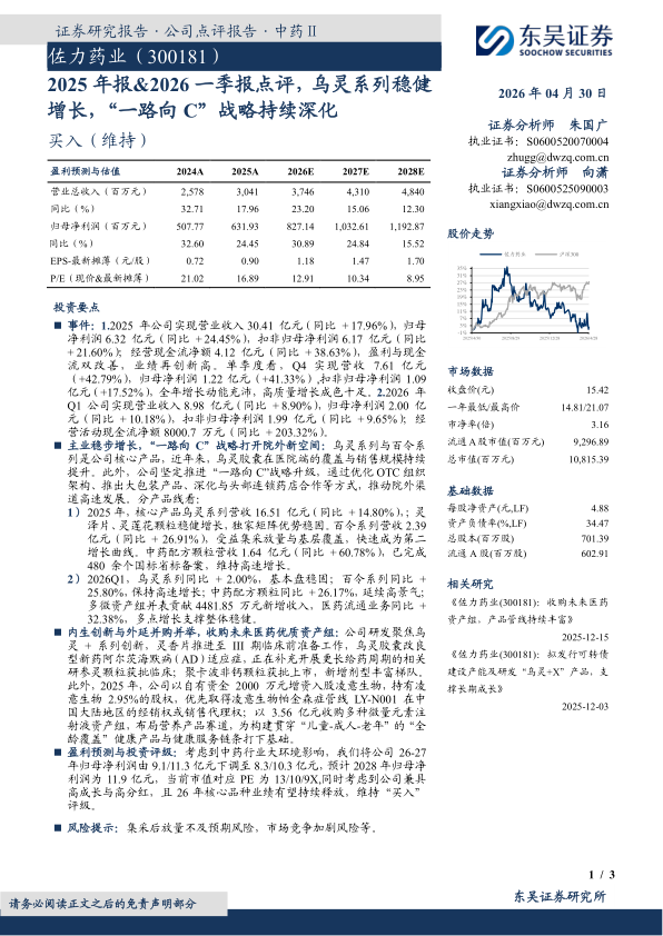 2025年报&2026一季报点评,乌灵系列稳健增长,“一路向 C”战略持续深化