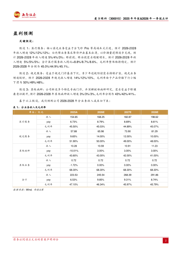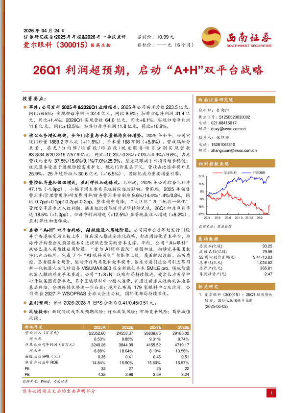 启动“A+H”双平台战略,AI赋能进入落地阶段。公司同步公告筹划发行H股并于香港联交所主板上市,旨在深入推进全球化战略,打造国际化资本平台,为海外并购整合及前沿技术引进提供更坚实的资本支撑。年内,公司“AI+眼科”战略已进入实质性应用阶段:“爱尔AI眼科医院”建设加速,持续完善集团数字化产品矩阵;完成7个“AI眼科医生”智能体上线,覆盖辅助诊断、病历质控、患者服务全场景,驱动诊疗均质化和效率提升。临床方面引进公司引进蔡司新一代机器人全飞秒设备VISUMAX800及全新微创手术SMILE pro,领跑智能机器人辅助屈光手术赛道。公司“1+8+N”战略布局持续推进,爱尔长沙医学中心升级集团直管单元,多个区域眼科中心投入运营,并通过新建或收购完善地县基层网络,分级连锁优势进一步凸显;境外已布局179家眼科中心及诊所,公司荣获2027年WSOPRAS全球大会主办权,国际化布局持续深化。