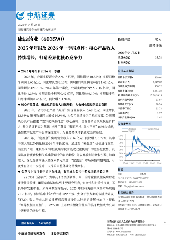 核心产品苏灵、密盖息销售收入持续增长,为公司业绩提供稳定支撑