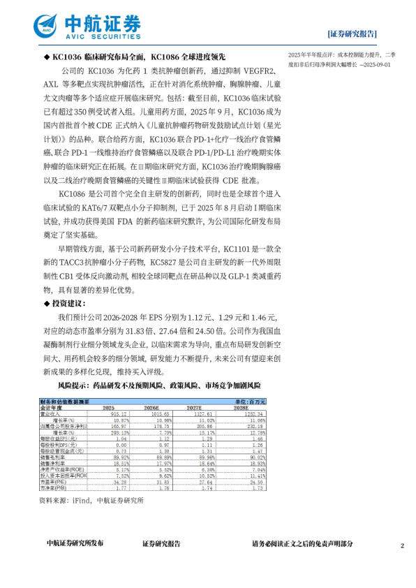 公司的KC1036为化药1类抗肿瘤创新药,通过抑制VEGFR2、AXL等多靶点实现抗肿瘤活性,正在针对消化系统肿瘤、胸腺肿瘤、儿童尤文肉瘤等多个适应症开展临床研究。包括:截至目前,KC1036临床试验已有超过350例受试者入组。儿童用药方面,2025年9月,KC1036成为国内首批首个被CDE正式纳入《儿童抗肿瘤药物研发鼓励试点计划(星光计划)》的品种。联合给药方面,KC1036联合PD-1+化疗一线治疗食管鳞癌、联合PD-1一线维持治疗食管鳞癌以及联合PD-1/PD-L1治疗晚期实体肿瘤的临床研究正在拓展。在Ⅲ期临床研究方面,KC1036治疗晚期胸腺癌以及二线治疗晚期食管鳞癌的关键性Ⅲ期临床试验获得CDE批准。