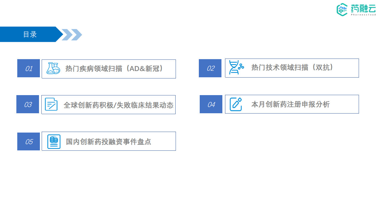本报告涉及: 相关药物:Molnupiravir、 Paxlovid、sotrovimab、卡西瑞单抗+伊德单抗、巴尼韦单抗、 Aducanumab、 GV-972、lecanemab、 Catumaxomab、 blinatumomab、emicizumab、 faricimab、amivantamab, 相关靶点:JAK、HER2、CDK4/7、BTK, 相关适应症:新型冠状病毒感染肺炎、阿尔茨海默症、双特异性抗体、斑秃、脑卒中 。