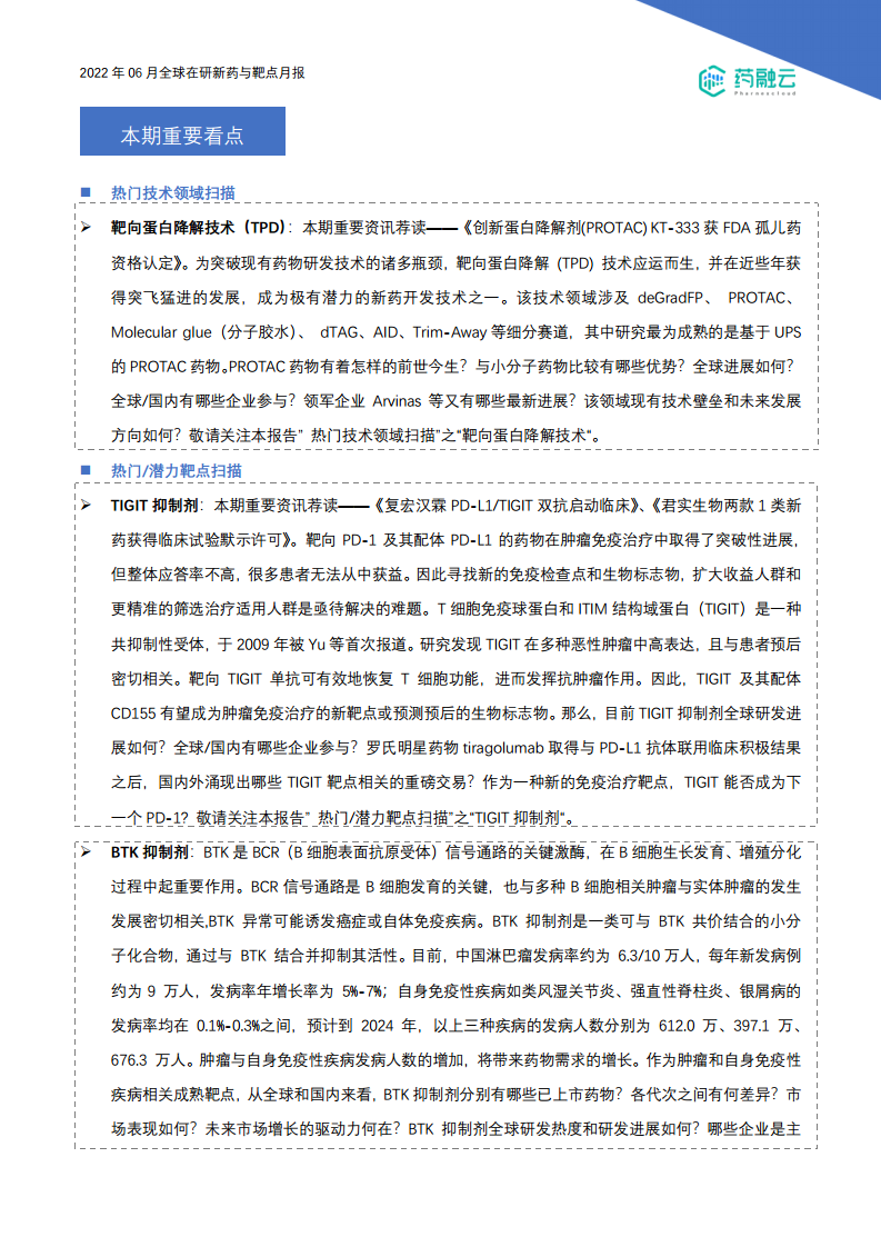 本报告总结了2022年6月全球在研新药与靶点市场的动态,核心观点如下: